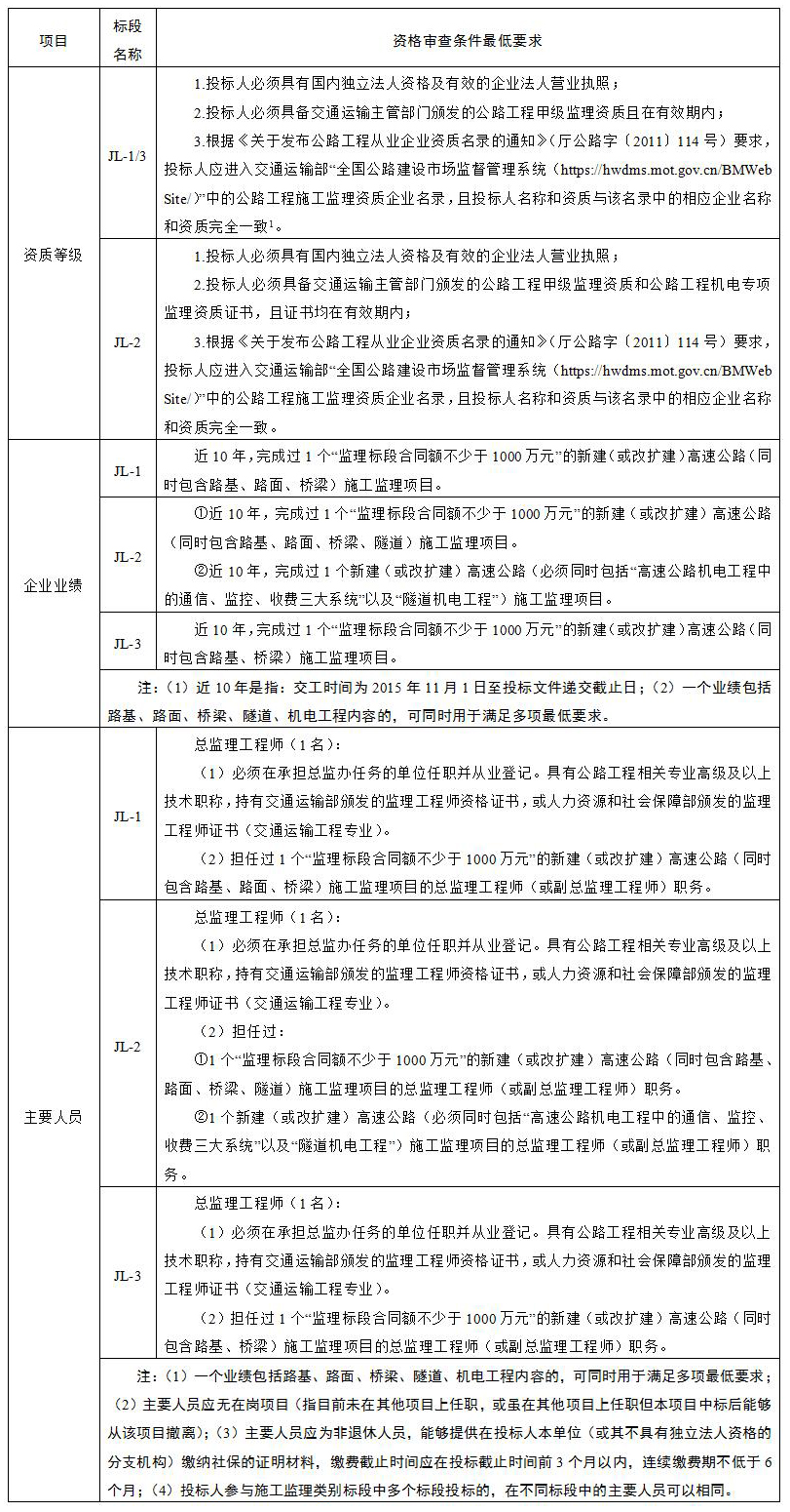 1本段规定仅适用于根据《关于发布公路工程从业企业资质名录的通知》(厅公路字〔2011〕114号)要求,招标人应通过名录对投标人资质条件进行审核的公路监理企业;如前款文件中规定的资质已由省级相关部门负责审核、审批,则不做要求,招标文件中凡涉及类似要求均以此为准。