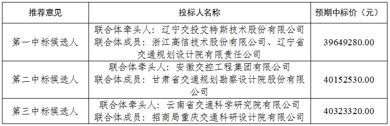 2025年辽宁省高速公路联网收费省中心系统升级及车道智能收费设备推广应用项目设计施工总承包招标评标工作于2025年10月11日在辽宁省沈阳市和阜新市结束,现将评标委员会推荐的中标候选人排序、名称、预期中标价公示如下: