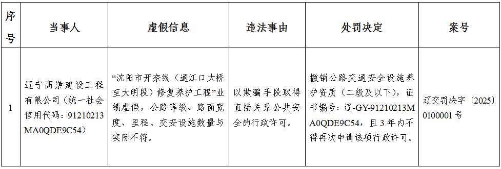 关于辽宁高崇建设工程有限公司弄虚作假失信行为处理情况的通报(辽交公路函〔2026〕5号)