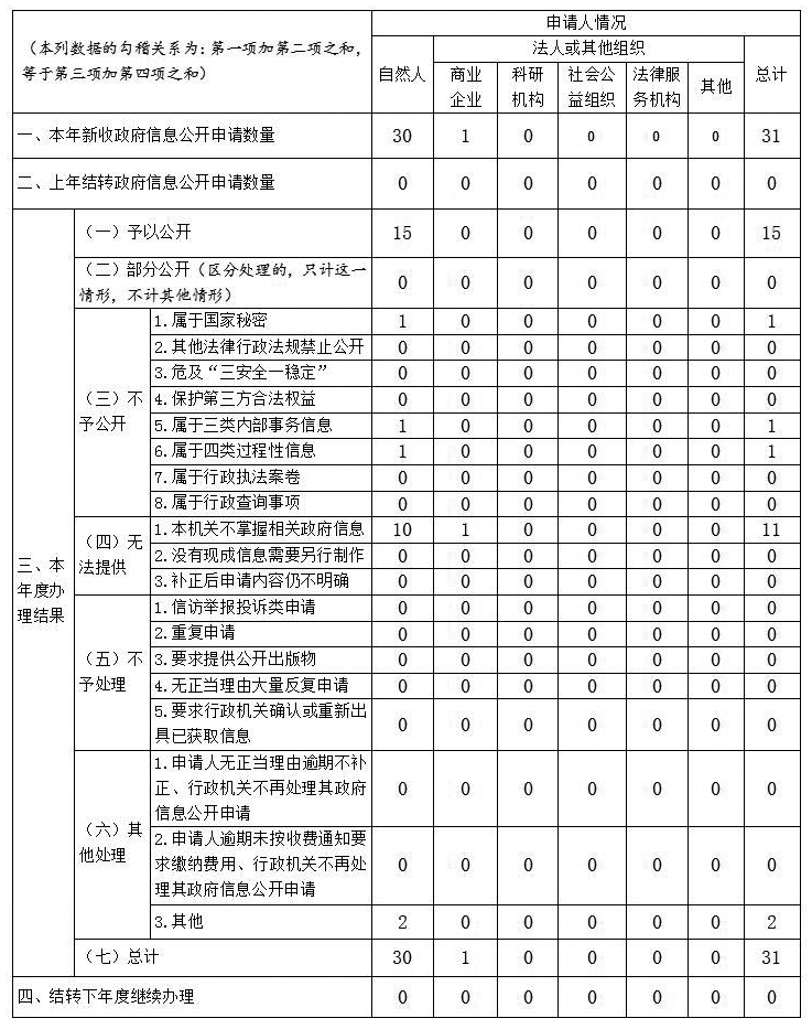 同时,严格规范办理政府信息公开申请答复,严格执行依申请公开答复文书格式,进一步提升政府信息公开申请办理工作质量。全年共收到办理公开政府信息申请31件。